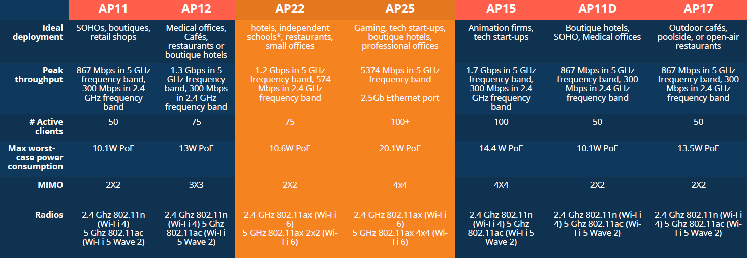Aruba, član porodice Hewlett Packard, nudi porodicu bežičnih pristupnih tačaka (AP) dizajniranih da malim i srednjim preduzećima daju performanse i sigurnosne karakteristike koje su tradicionalno ograničene na velika preduzeća. Uz modele dizajnirane za unutrašnje, spoljno, ugostiteljsko i SOHO okruženje, zadovoljene su potreba svih. Instant On AP koriste tehnologiju Auto Mesh koja omogućava korisnicima da prošire Wi-Fi pokrivenost sa istom jačinom signala u svaki kutak poslovanja. Korisnici mogu postaviti i upravljati Wi-Fi mrežom putem Instant On mobilne aplikacije ili web porta baziranog na Cloud-u.